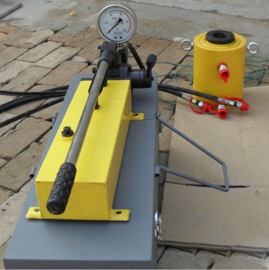 注意,手動泵必須擺成水平放置工作。檢測完畢應逆時針方向擰松泄油閥,使壓力表讀數(shù)為零,再把各部件由錨桿上卸下。