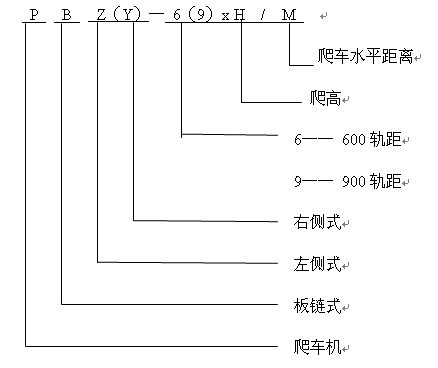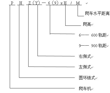液壓鏈?zhǔn)脚儡嚈C用于600軌距1t、1.5t及900軌距1.5t、3t礦車向上爬高,根據(jù)爬高不同共有14種型號,每種又根據(jù)傳動裝置布置方式不同分為左側(cè)式與右側(cè)式。