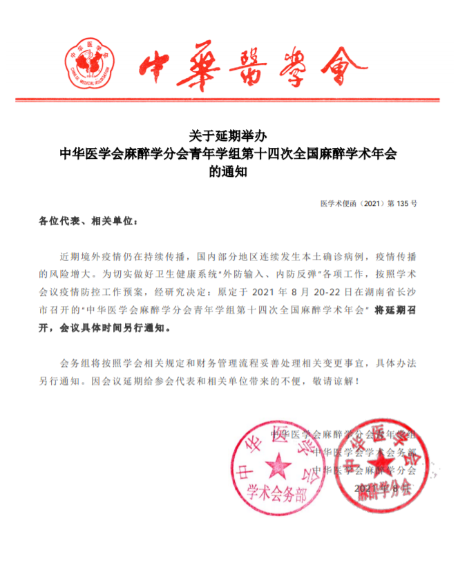 近期境外疫情仍在持續(xù)傳播,國內(nèi)部分地區(qū)連續(xù)發(fā)生本土確診病例,疫情傳播的風險增大。為切實做好衛(wèi)生健康系統(tǒng)“外防輸入、內(nèi)防反彈”各項工作,按照學術會議疫情防控工作預案,經(jīng)研究決定:原定于2021年8月20-22日在湖南省長沙市召開的“中華醫(yī)學會麻醉學分會青年學組第十四次全國麻醉學術年會”將延期召開,會議具體時間另行通知。